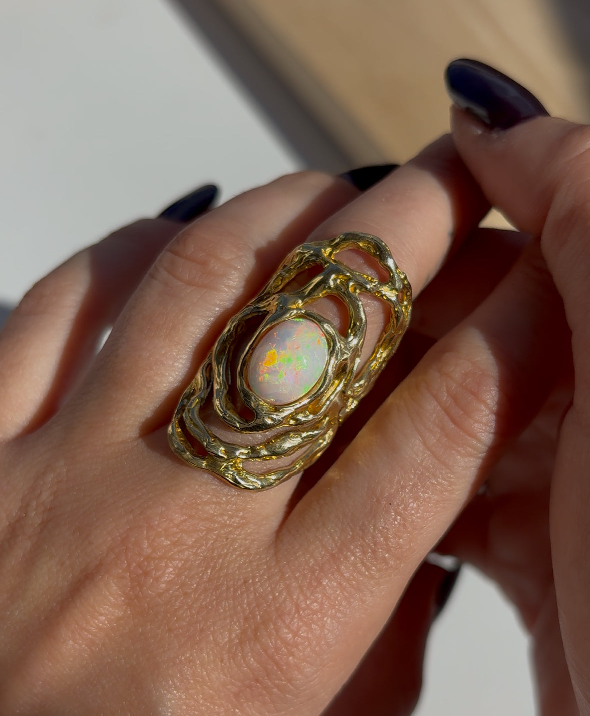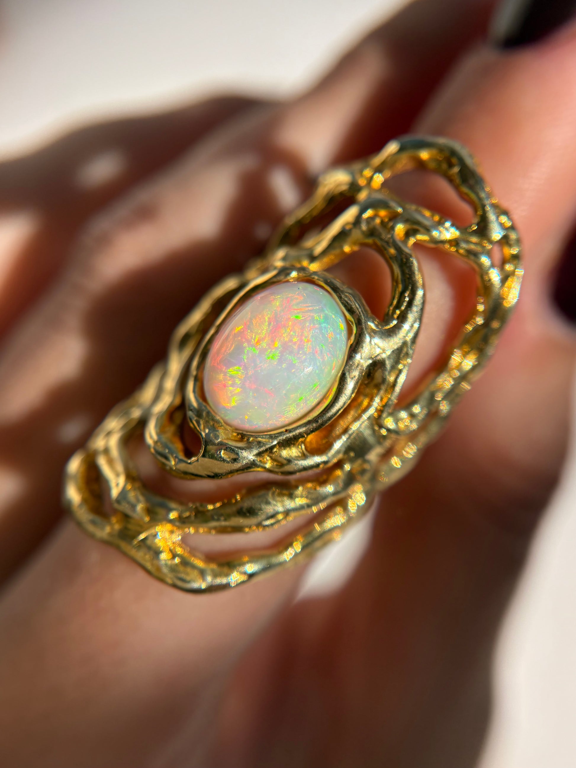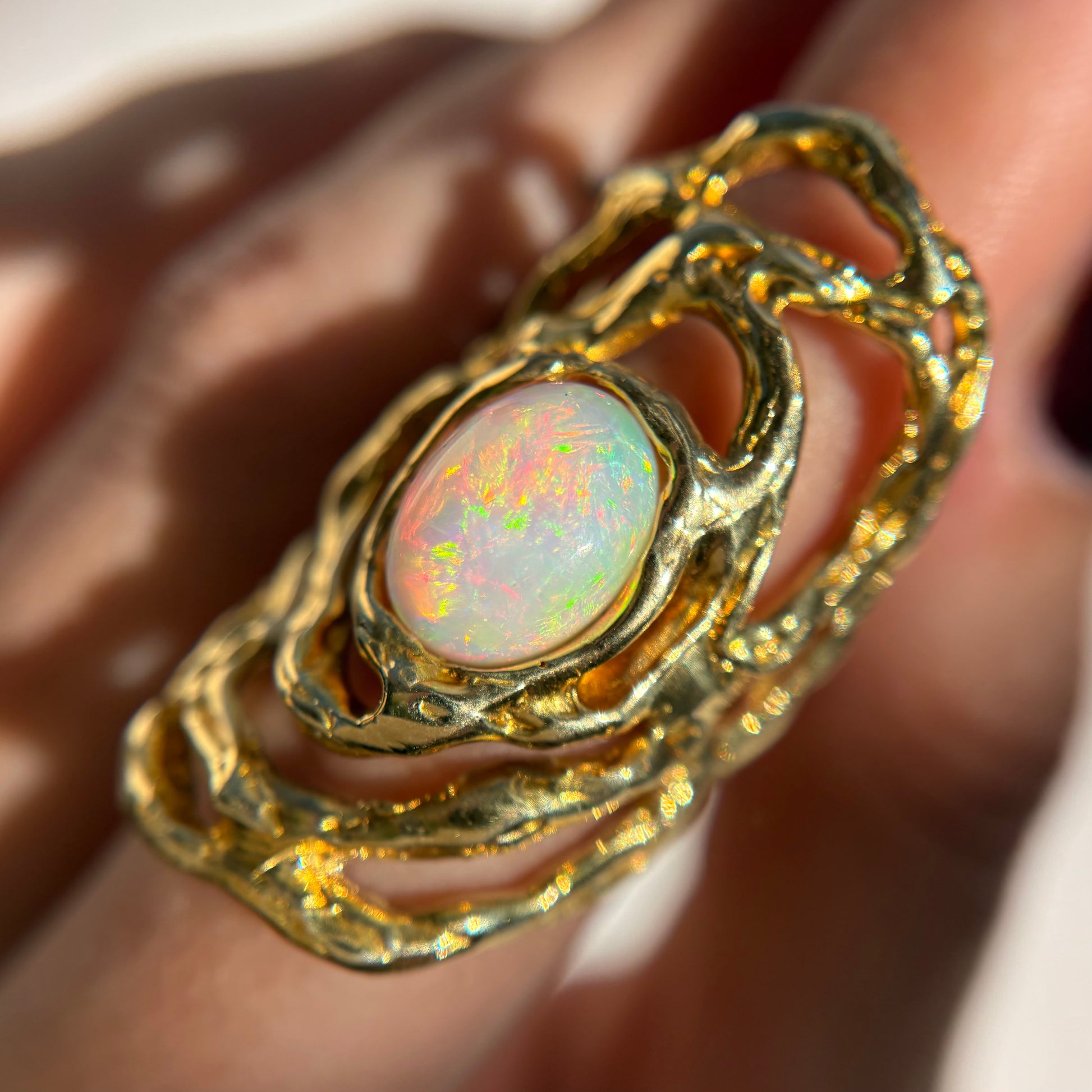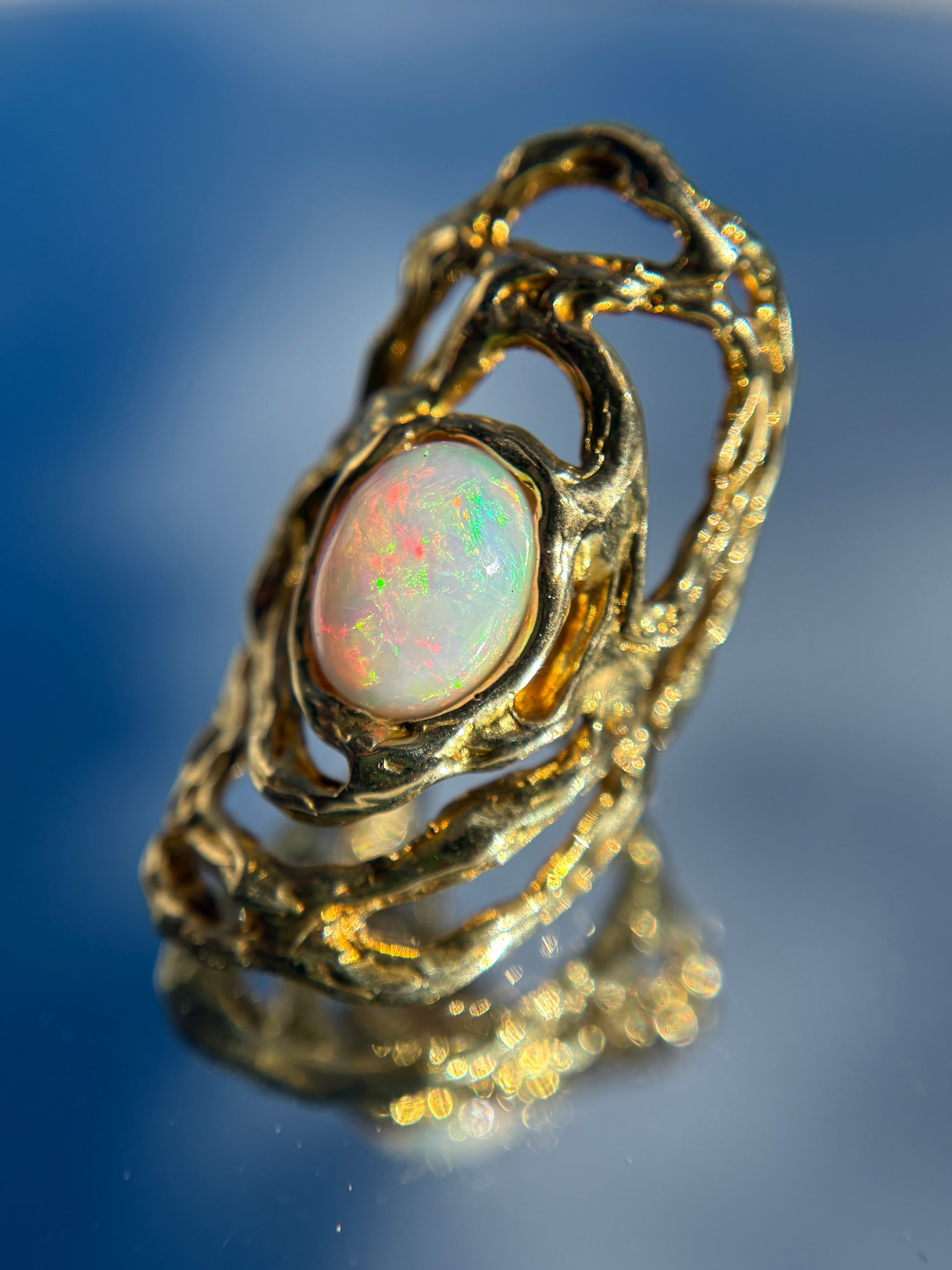 Questo anello è interamente realizzato a mano, attraverso la tecnica della cera persa e la lavorazione tradizionale al banco orafo. Ogni dettaglio è modellato e rifinito a mano, rendendo ogni pezzo irripetibile. Il materiale si chiama brone, la pietra è un opale che ho acquistato in Thailandia.