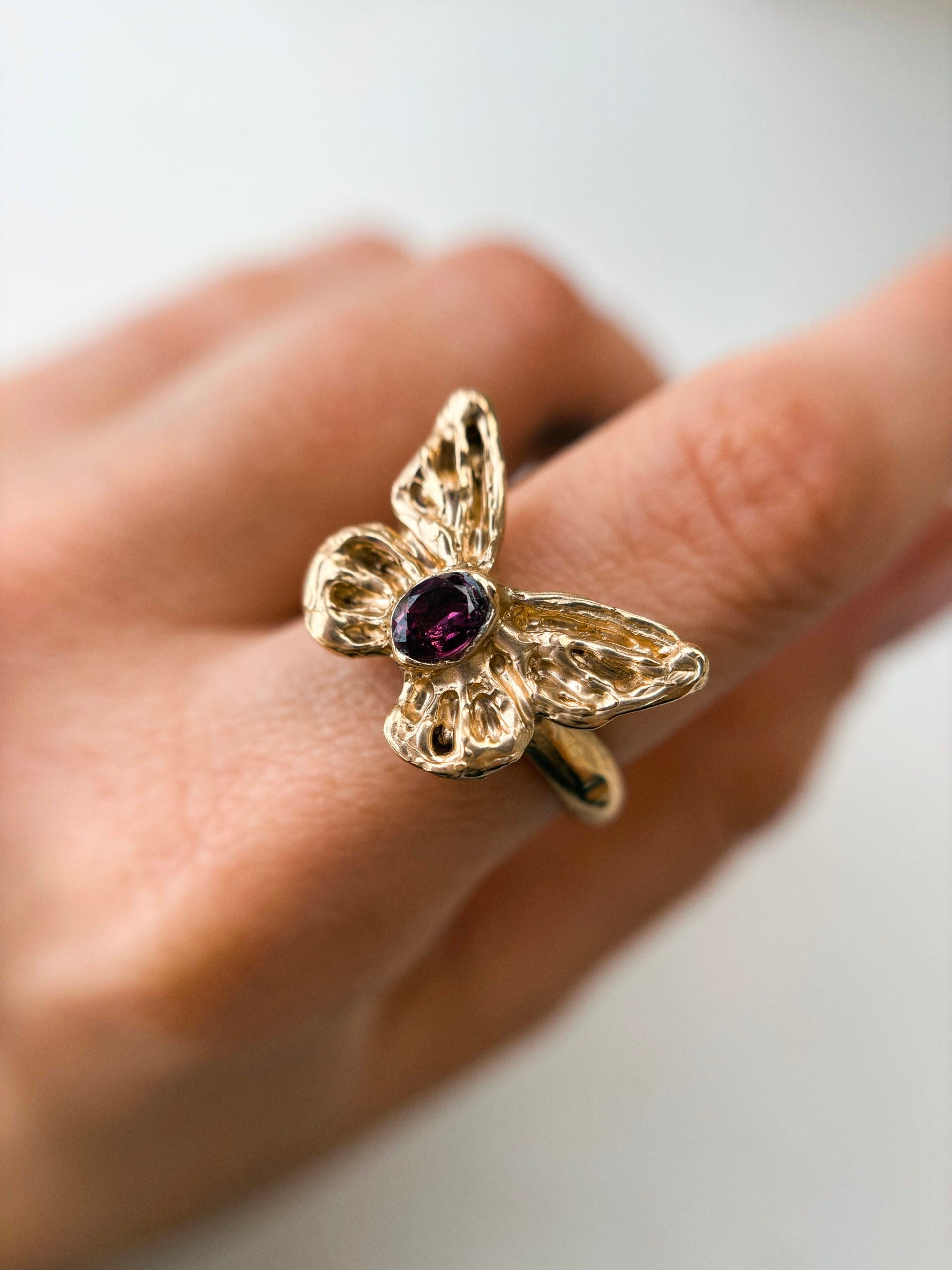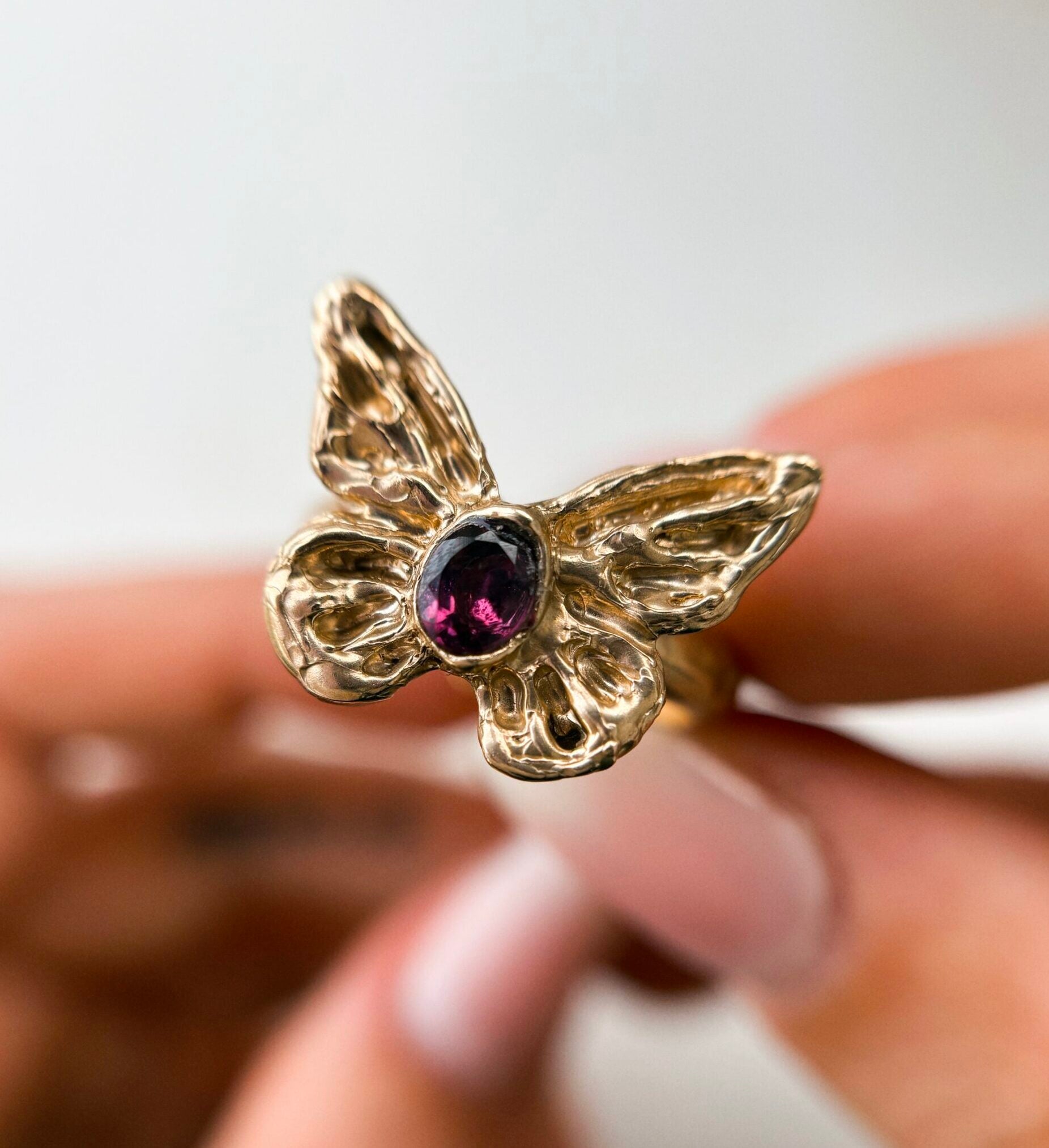 Questo anello è interamente realizzato a mano, attraverso la tecnica della cera persa e la lavorazione tradizionale al banco orafo. Ogni dettaglio è modellato e rifinito a mano, rendendo ogni pezzo irripetibile. Rodolite naturale.