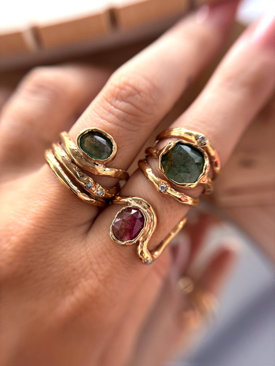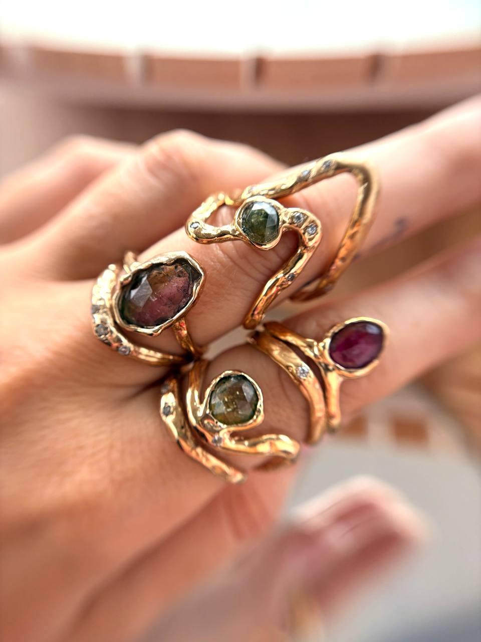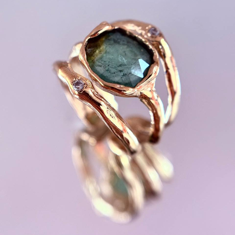 Le tormaline sono pietre di connessione e di armonia, ma anche di diversità: nessuna è uguale all’altra, ognuna porta con sé sfumature irripetibili, proprio come le persone che le indosseranno. Trasformarle in gioielli è stato un atto intimo, quasi rituale: unire il ricordo di quel viaggio al mio lavoro quotidiano, fondendo paesaggi lontani, memorie e materia viva.