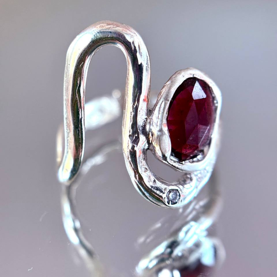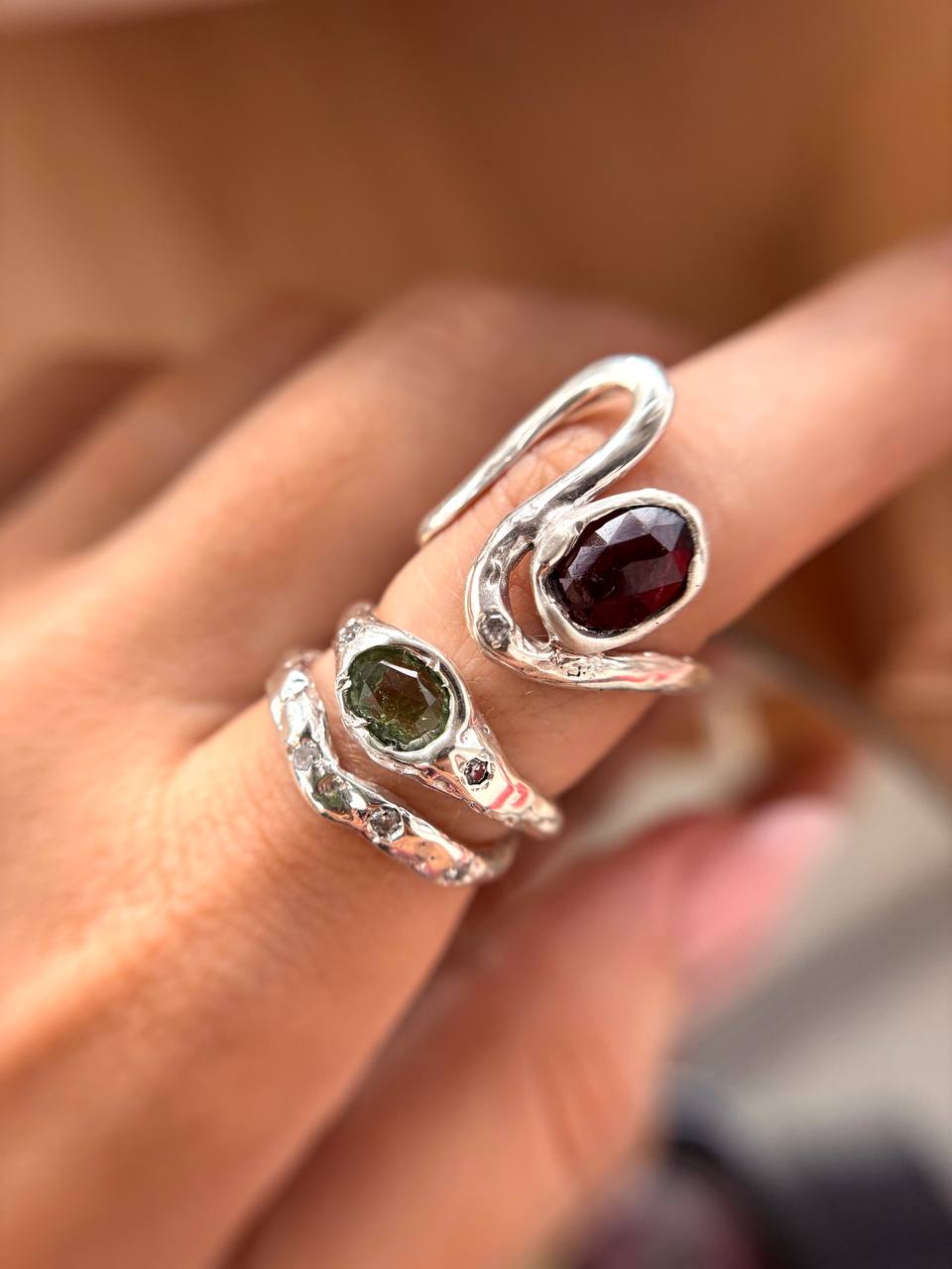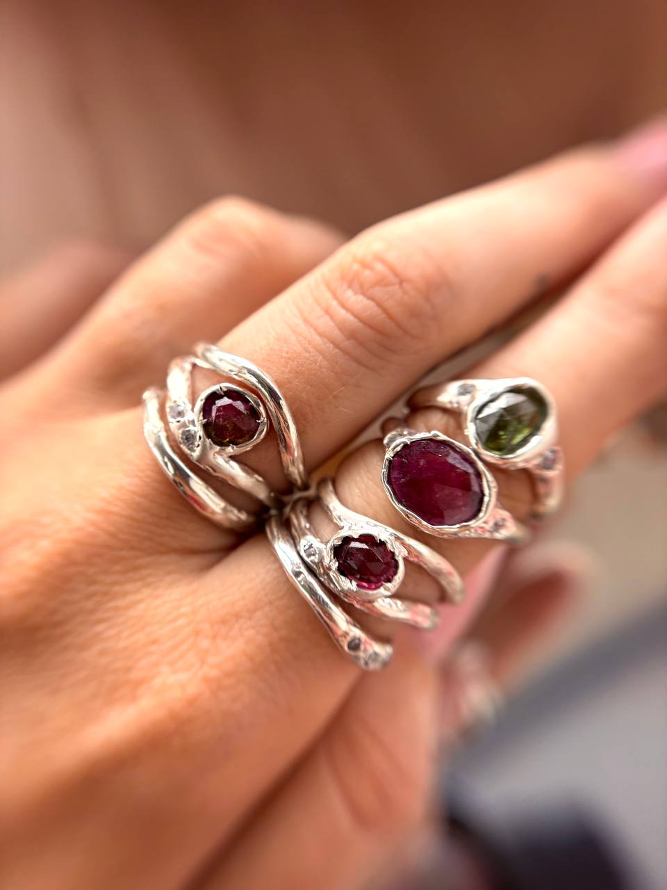 Questo anello è interamente realizzato a mano, attraverso la tecnica della cera persa e la lavorazione tradizionale al banco orafo. Ogni dettaglio è modellato e rifinito a mano, rendendo ogni pezzo irripetibile. Tormaline naturali e zirconi.