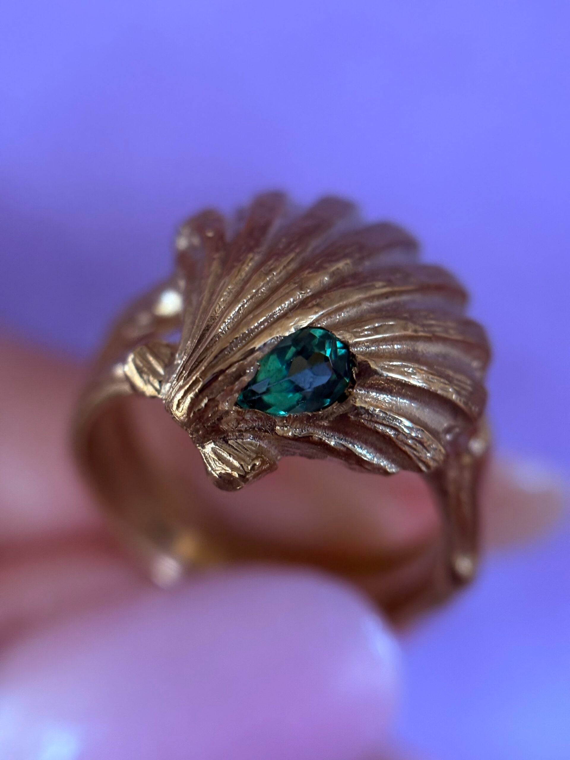 L’anello Halie è una creazione artigianale unica in bronzo, impreziosita da tormalina verde naturali. Il design riprende la forma elegante e simbolica della conchiglia. Realizzato interamente a mano con la tecnica tradizionale della fusione a cera persa, ogni pezzo è modellato, fuso e rifinito al banco orafo, garantendo dettagli precisi e una qualità senza tempo.
