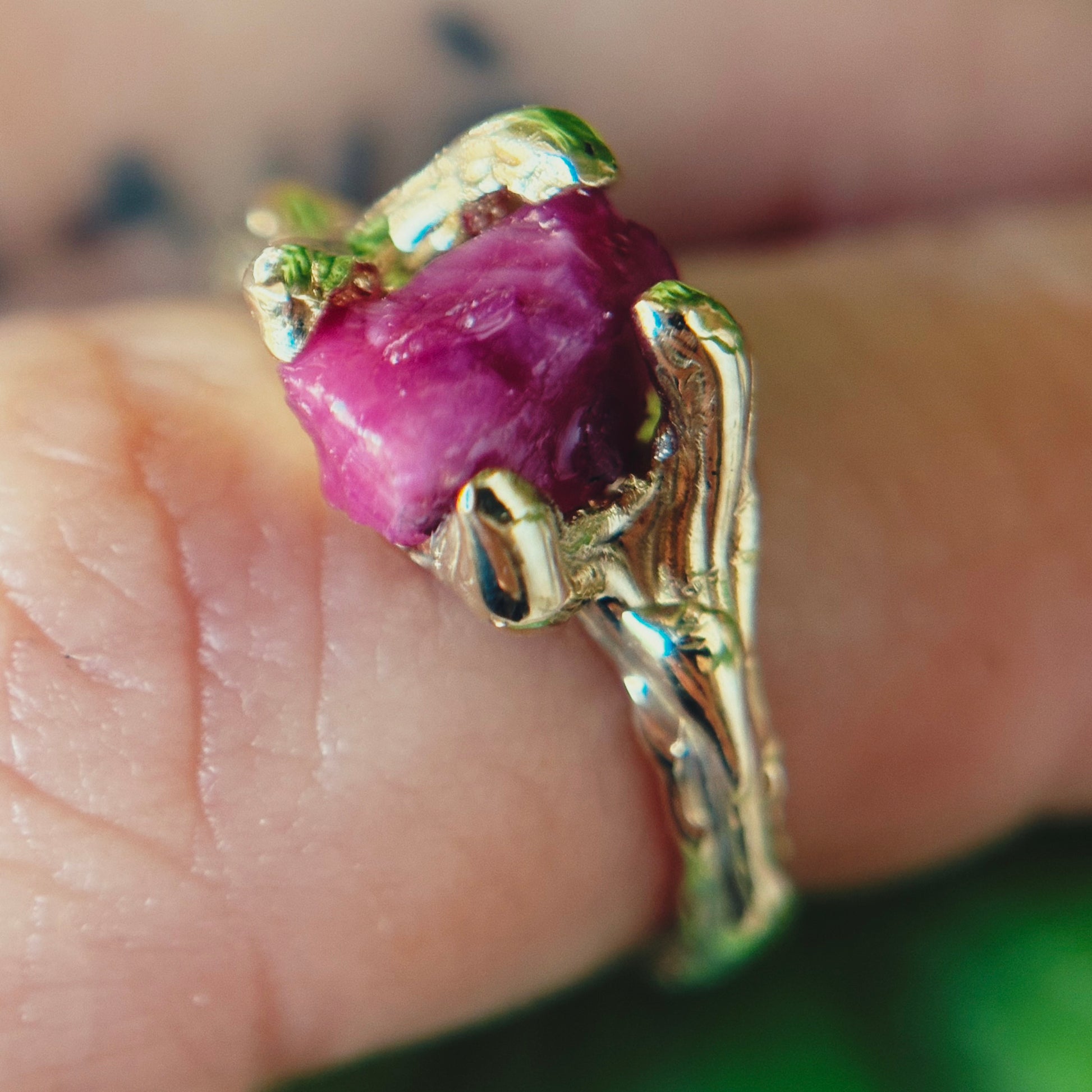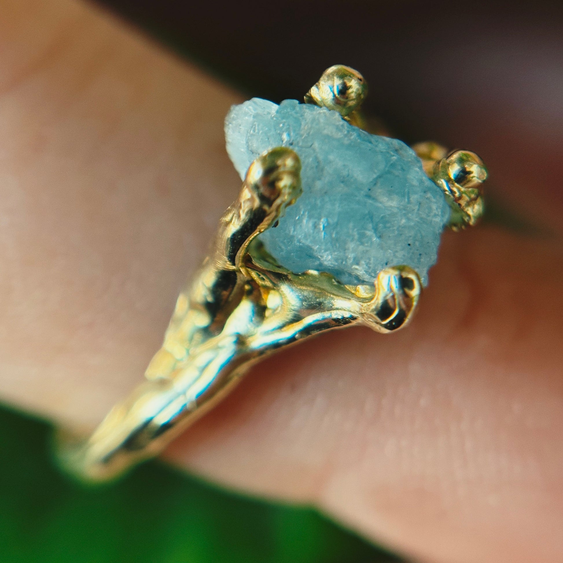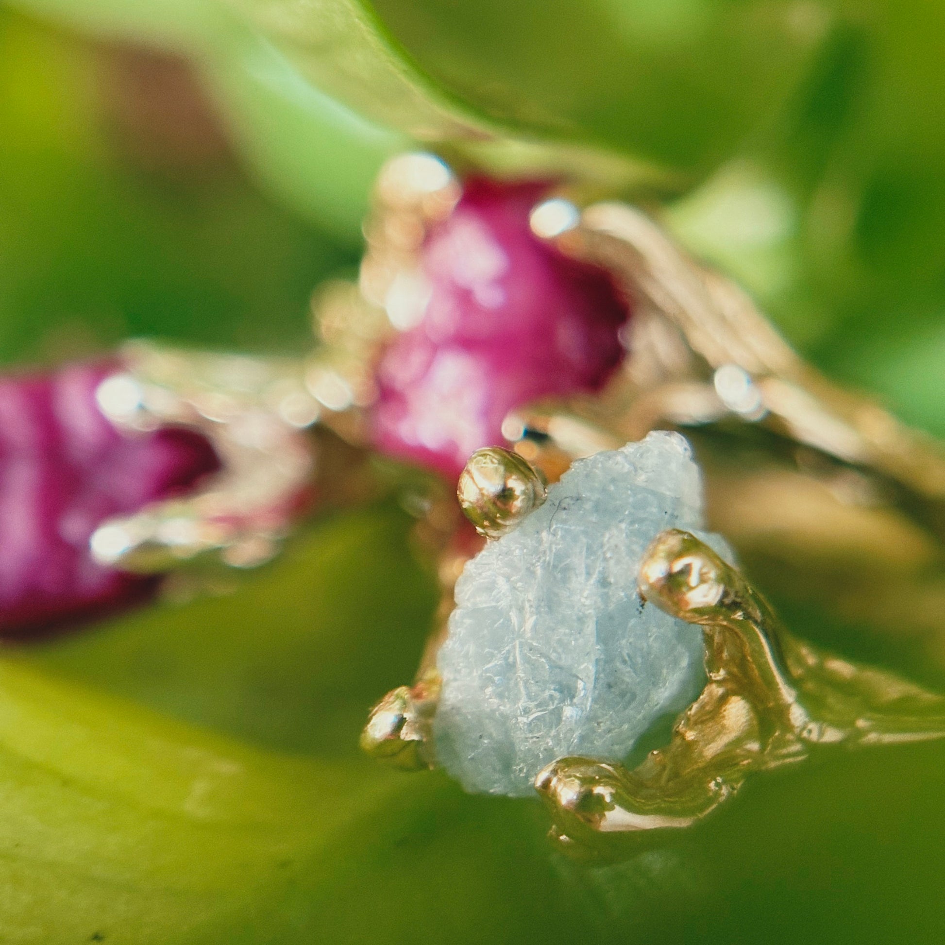 Le pietre utilizzate - acquamarina, rubini, diamanti di Herkimer, peridoto e apatite - le ho prese durante il mio viaggio in Thailandia. Le ho scelte così come la natura le ha create: grezze, vive, imperfette, testimoni autentiche del tempo e della terra da cui provengono. Trasformarle in gioielli è stato un atto intimo, quasi rituale: unire il ricordo di quel viaggio al mio lavoro quotidiano, fondendo paesaggi lontani, memorie e materia viva.