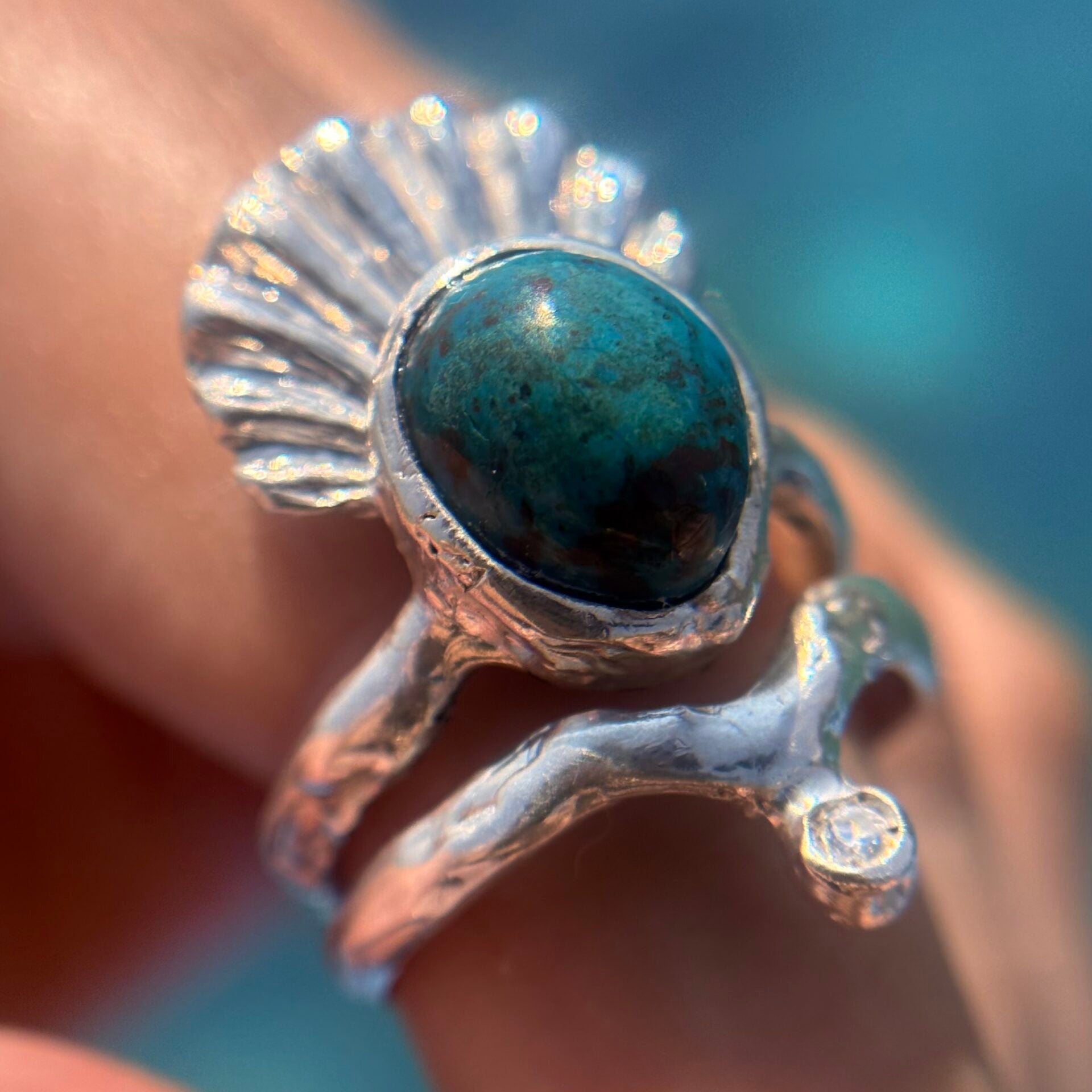 L’anello Halie è una creazione artigianale unica in bronzo, impreziosita da tormalina verde naturali. Il design riprende la forma elegante e simbolica della conchiglia. Realizzato interamente a mano con la tecnica tradizionale della fusione a cera persa, ogni pezzo è modellato, fuso e rifinito al banco orafo, garantendo dettagli precisi e una qualità senza tempo.